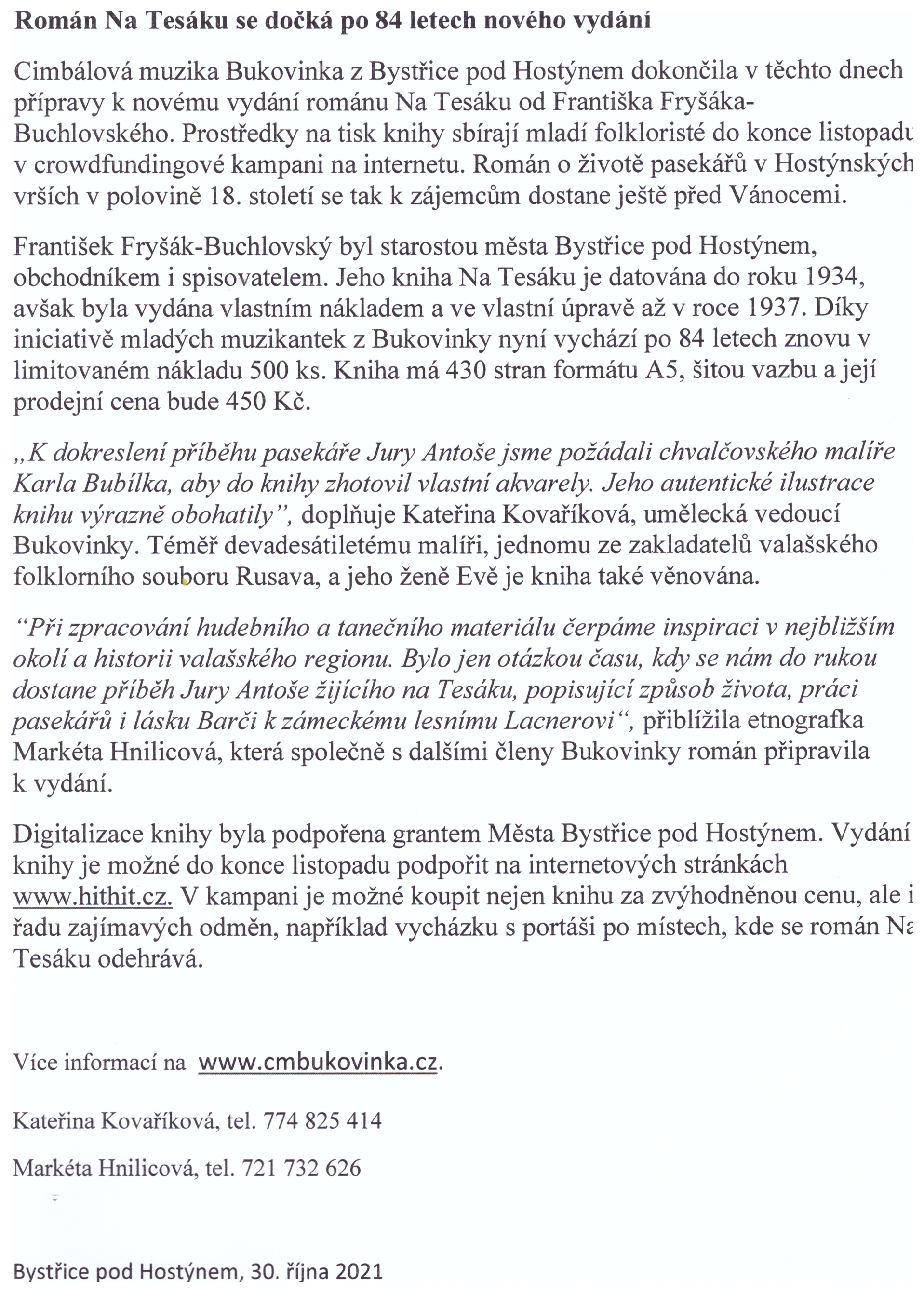 Cimbálová muzika Bukovinka z Bystřice pod Hostýnem dokončila v těchto dnech přípravy k novému vydání románu Na Tesáku od Františka Fryšáka-Buchlovského. Bližší info v příloze.